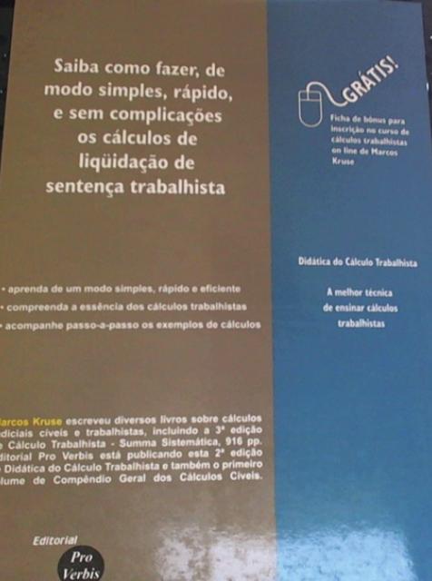 Cálculo Trabalhista - Summa Sistemática, Rio de Janeiro:Forense É uma obra essencial para todo profissional que labuta na seara do Direito Trabalhista. Conhecer a sistemática que norteia o cálculo estabelece o prumo para o trabalho jurídico de advogados e juízes do trabalho. A obra apresenta, além da fundamentação técnica sobre os diferentes temas que cercam a matéria trabalhista, exemplos detalhados de como os cálculos são elaborados com o uso de planilhas eletrônicas. Um aspecto importante a ser considerado é que a perenidade da obra, eis que a matéria posta em discussão são os cálculos trabalhistas matéria que, a rigor, não apresenta os desgastes que sofrem outras obras jurídicas especialmente se for considerada a constante modificação legislativa. Os cálculos trabalhistas são analizados no conjujnto da obra em função do tripé básico que inclui a formação da base de cáculo, a quantificação e qualificação das horas extras e o estudo dos reflexos. Quase a completar um decênio de publicação, Cálculo Trabalhista ainda é uma das obras fundamentais para operadores do direito trabalhista.